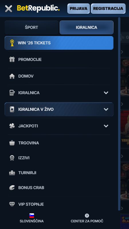 Čeprav je ta pregled namenjen izključno športnim stavam, je vredno omeniti, da ima BetRepublic tudi ločen casino del. Na isti platformi so poleg športnih stav še igralni avtomati, live casino, instant igre, jackpoti in namizne igre. To je priročno, če želiš vse pod enim računom, sam pa pri takih platformah vedno priporočam, da športne promocije in casino bonuse gledaš strogo ločeno.