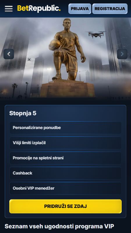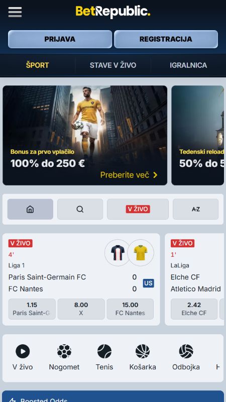BetRepublic sem začel preverjati predvsem zato, ker na isti platformi združuje športne stave, live betting in ločen casino del. Na slovenski športni strani daje poudarek kvotam, promocijam in hitremu dostopu do glavnih lig. V nadaljevanju sem zbral najpomembnejše informacije o bonusih, varnosti, plačilih in sami športni ponudbi, da si lahko hitro ustvariš realno sliko, ali ti ta stavnica sploh ustreza.