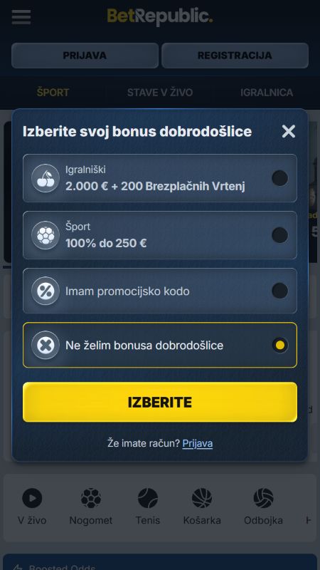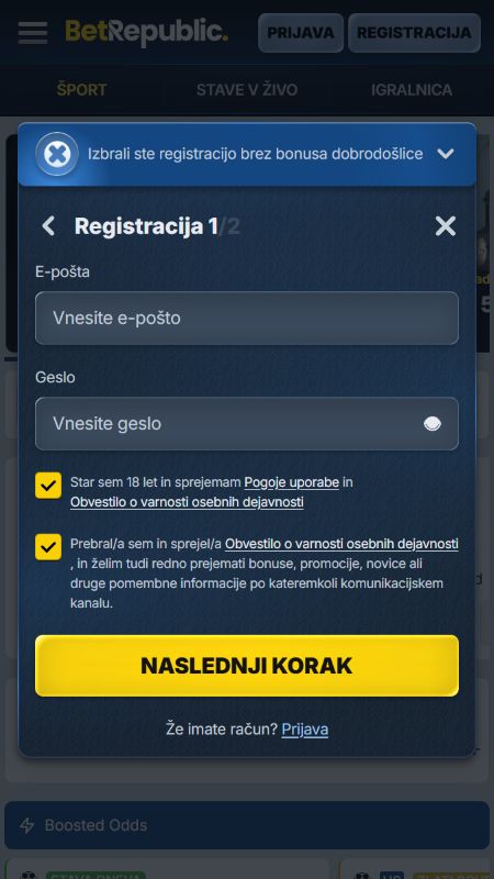 Registracija pri BetRepublic je po mojem vtisu precej enostavna, saj te obrazec vodi po klasičnih korakih in ne komplicira po nepotrebnem. Pomembno je predvsem to, da podatke vneseš pravilno že na začetku, ker jih lahko kasneje preverjajo pri dvigu.