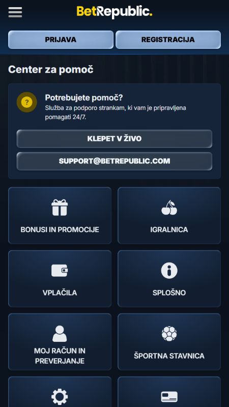 Podpora je pri BetRepublic ena izmed bolj jasno predstavljenih stvari. V centru za pomoč je zapisano, da je na voljo 24/7, glavna kontaktna kanala pa sta klepet v živo in e pošta support@betrepublic.com. Slovenska jezikovna različica strani je na voljo, kar je za domače uporabnike plus. Telefonske številke ali javno izpostavljenega poštnega naslova na pregledanih straneh nisem zasledil.