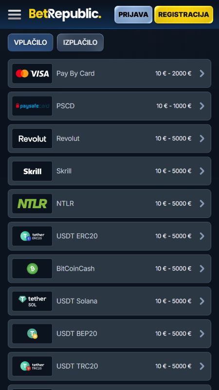 Pri BetRepublic na pregledanih uradnih straneh nisem opazil posebej izpostavljene mobilne aplikacije za Android ali iOS. Je pa mobilna verzija strani pripravljena dovolj dobro, da jo lahko brez težav uporabljaš v brskalniku. Meni je všeč, da so glavni športi hitro dosegljivi, live del ostane pregleden, stran pa si lahko dodaš tudi kot bližnjico na začetni zaslon telefona.