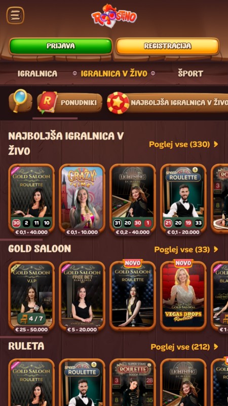 Sekcija live casino je pri Roostinu ena močnejših, na uradni strani omenjajo več kot 90 iger v živo. Na voljo so klasične mize, kot so ruleta, blackjack in bakarat, pa tudi hitrejše igre in show formati. Všeč mi je, da lahko hitro filtriraš po vrsti igre in da se prenos običajno nalaga gladko tudi na telefonu.