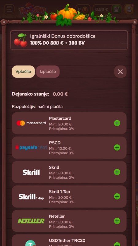 Roostino podpira več običajnih plačilnih metod, od kartic in e denarnic do kriptovalut. Vplačila so praviloma takojšnja, pri izplačilih pa se lahko čas razlikuje glede na metodo in na to, ali je račun že verificiran. Ker se pogoji razlikujejo po državi, je najbolje, da v blagajni preveriš točne limite za svojo metodo.