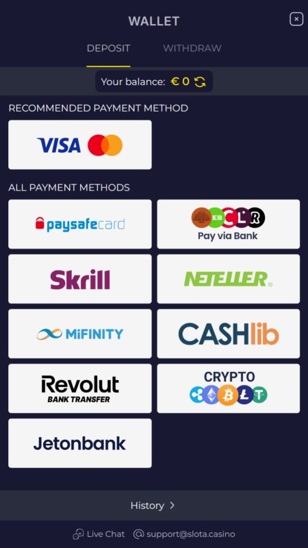 Slota Casino ponuja širok nabor plačilnih metod, od bančnih kartic in e-denarnic do bogate izbire kriptovalut. Vplačila so bila izvedena takoj brez dodatnih stroškov. Izplačila so bila obdelana v razumnem času, kripto pa je najhitrejša možnost. Vmesnik za upravljanje transakcij je pregleden tudi na mobilnih napravah: