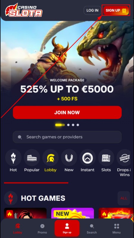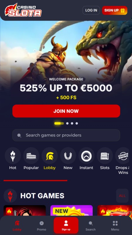 Slota Casino ima izrazito spartansko-rimsko tematiko, ki ji daje pečat ozadje v temno modri barvi z rdečimi in rumenimi poudarki ter ilustracijami rimskih bojevnikov, kraljev in kraljic. Vmesnik je pregleden, glavne kategorije so v glavnem meniju, igre se nalagajo brez zatikanja. Registracija je bila opravljena v nekaj minutah brez nepotrebnih korakov. Tudi na telefonu je izkušnja zelo podobna kot na računalniku, kar je velik plus za vsakodnevno uporabo.