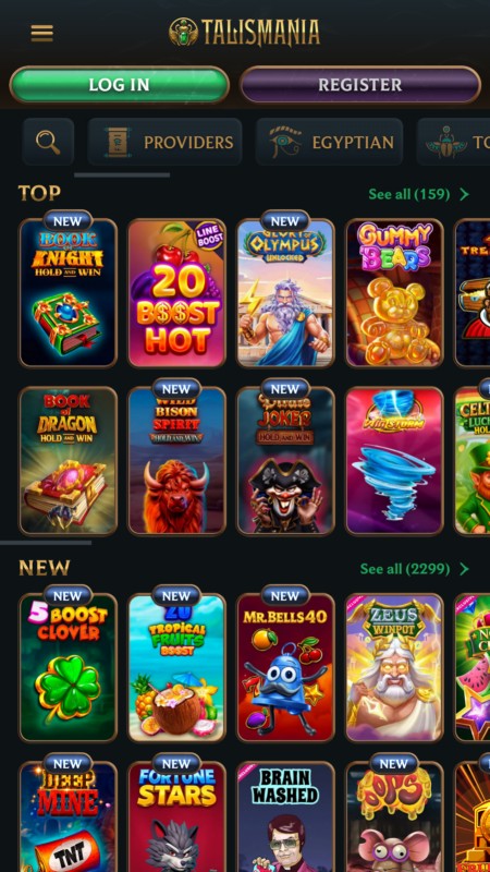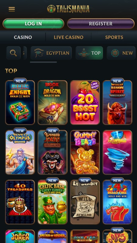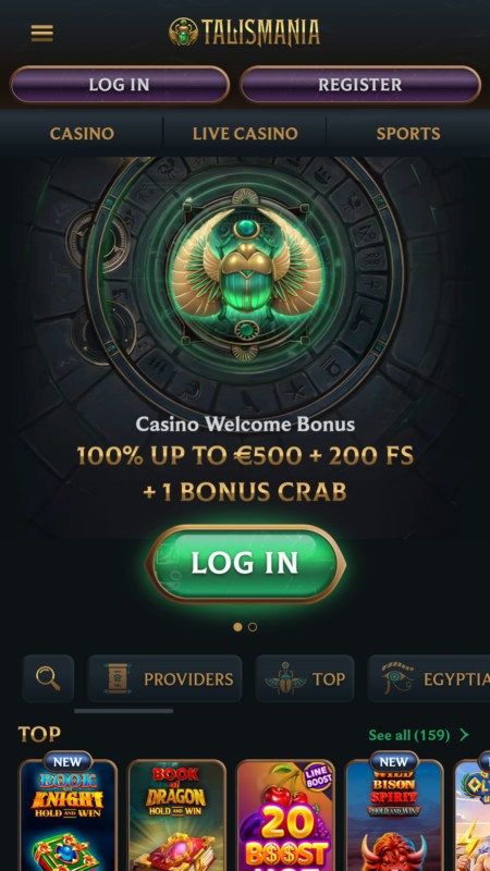 Talismania Casino ima nekoliko skrivnosten, »zakladni« vizualni slog, ki ga dopolnjujejo tematske kategorije iger (npr. Egyptian) in poudarek na igrifikaciji. Vmesnik je pregleden, ključne kategorije so hitro dosegljive, bonus funkcije (Shop, Bonus Crab, izzivi, turnirji) pa so jasno izpostavljene, zato je uporabniška izkušnja tako za začetnike kot za izkušene igralce zelo tekoča.