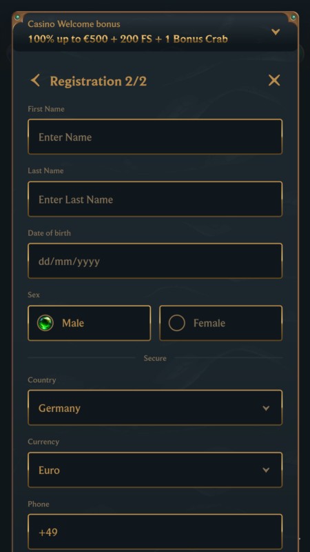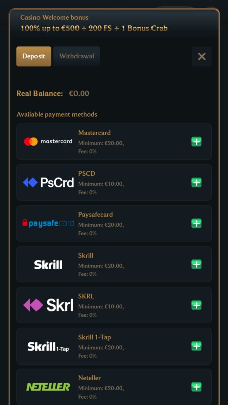 Kot nov igralec lahko aktivirate bonus dobrodošlice: 100 % na prvi depozit do 500 € + 200 brezplačnih vrtljajev + 1 Bonus Crab kredit. Minimalni polog za celoten paket je 20 €. Za sprostitev bonusa je treba opraviti 35x (bonus + depozit), dobitke iz brezplačnih vrtljajev pa 40x. Rok za izpolnitev pogojev je 10 dni.
