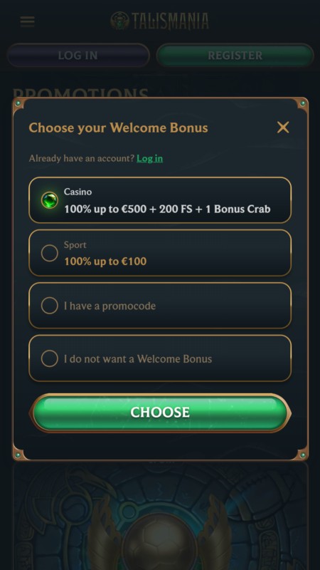 Talismania Casino poleg klasičnih bonusov stavi tudi na igrifikacijo – na voljo so izzivi, turnirji, zbiranje kovancev, Shop in mini igra Bonus Crab. Spodaj so glavne promocije, ki jih lahko pričakujete v kazinoju.