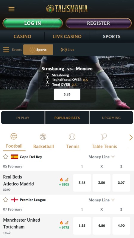 Da, Talismania poleg igralnice ponuja tudi športno stavnico, do katere dostopaš prek zavihka Sports. Na voljo so predčasne stave, Live Betting za stave v živo ter Virtual Sports. Pokritost vključuje najbolj priljubljene športe, kot so nogomet, tenis, namizni tenis in košarka, ter tudi hokej na ledu, ameriški nogomet in baseball. Vmesnik je hiter in pregleden, kvote pa so primerne za sestavljanje kombinacij. Občasno dodajo akcije, kot so ojačitev akumulatorjev (Accumulator Boost) ali zgodnje izplačilo pri nogometu (2 Goals Ahead). V ponudbi so turnirji in statistika tekem, zato je izbor trgov širši kot samo končni izid. Za mobilno uporabo deluje v brskalniku.