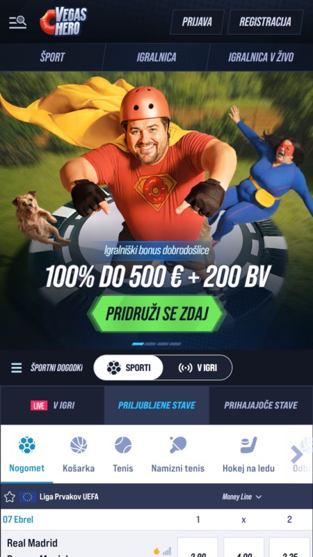 Da, VegasHero poleg kazinoja ponuja tudi športne stave, ki so ločene v svojo sekcijo, zato jih lahko uporabljaš neodvisno od igralniškega dela. Na voljo so klasične predtekmovalne stave in tudi stave v živo, kjer se kvote sproti prilagajajo dogajanju. V praksi sem opazil, da je ponudba narejena široko, z največ poudarka na nogometu, košarki in tenisu, zraven pa so še hokej, rokomet, odbojka in e špor ti. Če rad kombiniraš več dogodkov, je listič pregleden, preklapljanje med trgi pa hitro.