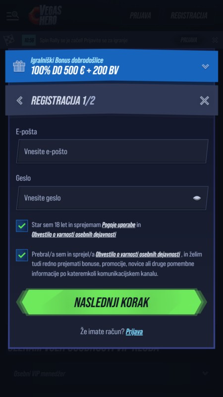 Postopek registracije na VegasHero je hiter in pregleden, zato sem račun ustvaril brez zapletov. V nekaj klikih si prijavljen, in po prvem pologu si praktično takoj pripravljen na zabavo.
