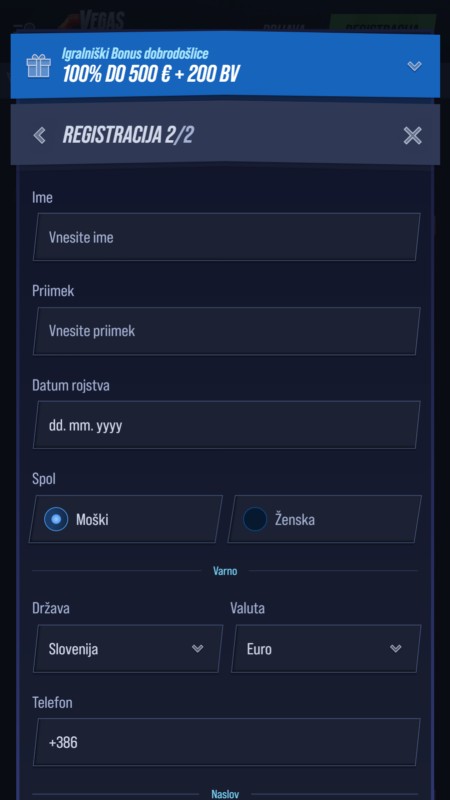 Korak 2 – Izberi svoj bonus dobrodošlice Izberi bonus, ki ti najbolj ustreza – VegasHero ponuja kazino bonus dobrodošlice 100 % do 500 €, 200 brezplačnih vrtljajev. Če želiš, lahko nadaljuješ tudi brez bonusa.