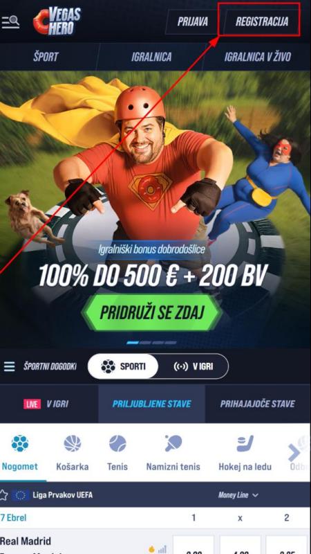 Korak 1 – Obišči spletno stran Odprite https://vegashero.com/ in v zgornjem desnem kotu kliknite na zelen gumb Registracija.