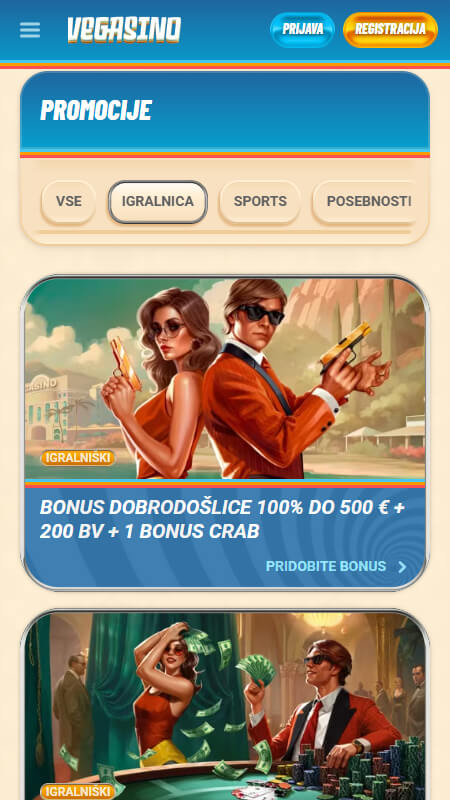 Vegasino nima ločene mobilne aplikacije, vendar je mobilna verzija spletne strani narejena zelo dobro. Na telefonu so kategorije (Casino, Live Casino, Sports) jasno ločene, gumbi so dovolj veliki, kvote in igre pa se nalagajo hitro. Všeč mi je, da so promocije in “blagajna” vedno hitro dosegljive, zato se ne izgubiš, ko želiš narediti polog ali preveriti bonus. Če želiš še hitrejši dostop, si lahko stran shraniš kot bližnjico na začetni zaslon in jo uporabljaš skoraj kot aplikacijo.
