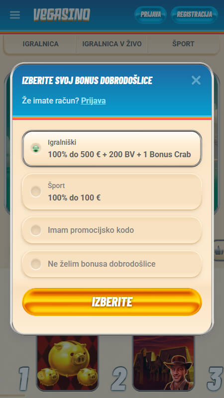 | 🎁 Bonus dobrodošlice | 100% do 500 € + 200 BV + 1 Bonus Crab (min. polog 20 €) |