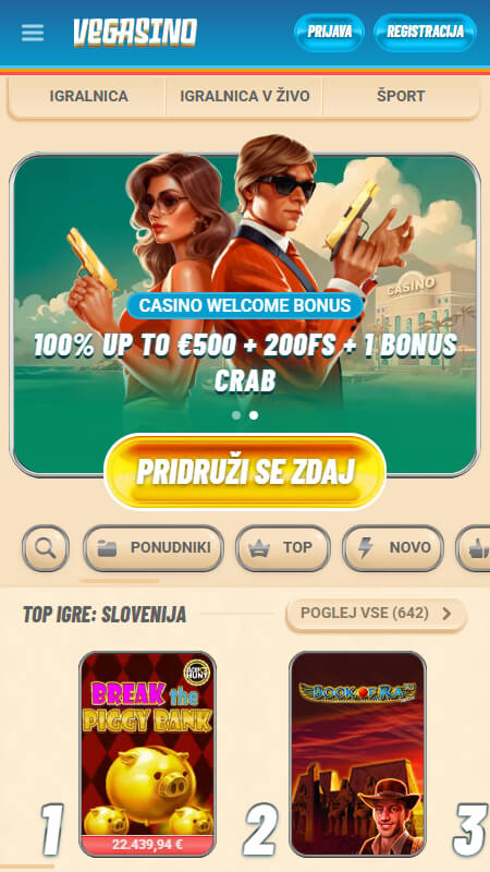 Vegasino je zelo “športno” zasnovan in to se pozna pri celotni izkušnji: veliko kartic, hitri filtri in jasno ločene sekcije (Casino, Live Casino, Sports). Barve so tople in svetlejše, z bež ozadjem ter poudarki v oranžni in modri, kar deluje moderno in malo drugače od tipičnih temnih kazinojev. Na računalniku je vse pregledno, na telefonu pa je postavitev še bolj smiselna, ker so gumbi veliki in se hitro premikaš med kategorijami. Registracija je kratka, po prijavi pa hitro prideš do blagajne, promocij in iger brez iskanja po menijih.