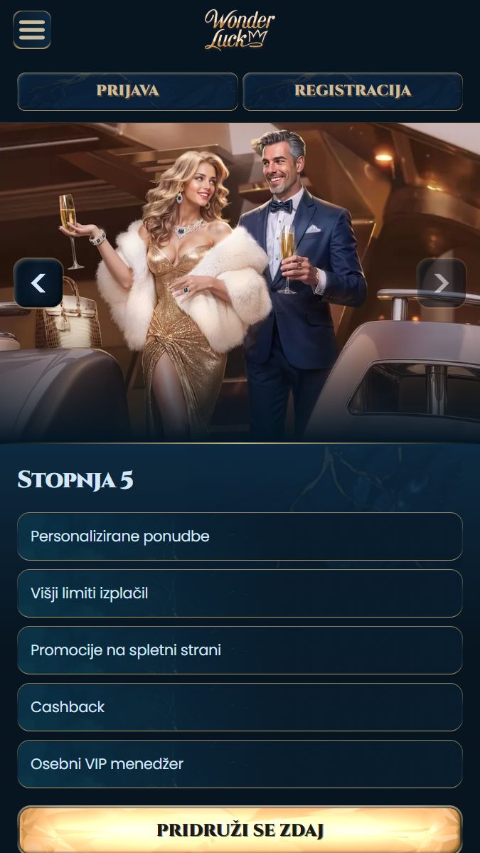 Wonderluck ponuja petstopenjski VIP program, kjer napredujete samodejno glede na svojo aktivnost. Že na začetku dobite dostop do 24-urne podpore, z višjimi stopnjami pa se odklenejo višji limiti izplačil, cashback in osebni VIP menedžer. Celoten sistem je zasnovan preprosto, brez dodatnih prijav ali pogojev.