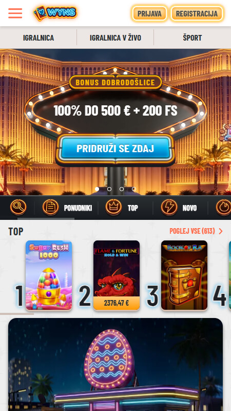 Vizualno je WYNS precej moderen: temnejša podlaga, močni poudarki pri promocijah in zelo “app-like” občutek v lobbyju. Navigacija mi je delovala logično, ker so sekcije jasno ločene (kazino, live, jackpoti, šport, promocije). Filtri po kategorijah in ponudnikih so skoraj nujni, ampak ravno to naredi veliko knjižnico obvladljivo.