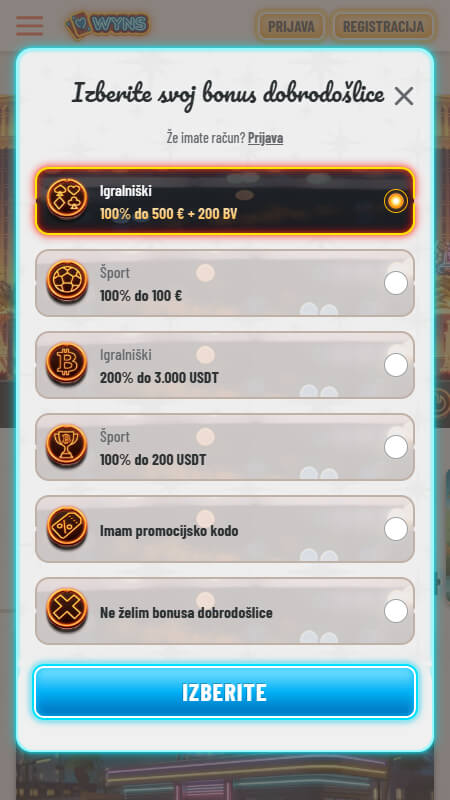 Glavni kazino bonus dobrodošlice je 100% do 500 € + 200 brezplačnih vrtljajev, kar je tudi jasno izpisano na domači strani. Poleg tega WYNS ponuja še kripto različico dobrodošlice (200% do 3.000 USDT). Pred aktivacijo se splača klikniti na opis bonusa v promocijah, ker so tam zapisani natančni pogoji, kot so zahteve po obratu in omejitve pri igri.