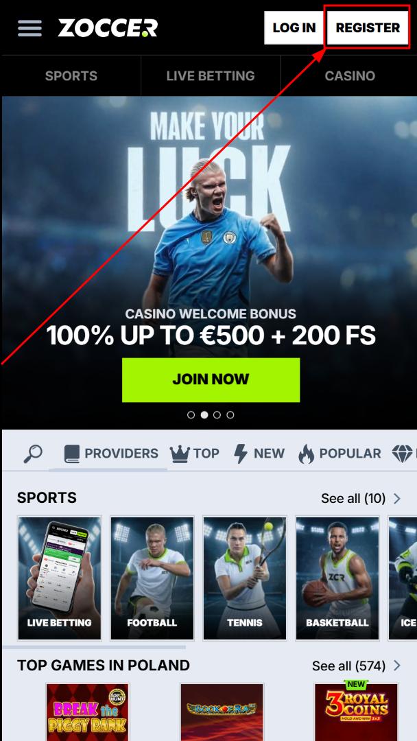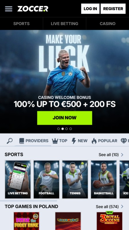 Zoccer mi deluje zelo “športno” in hitro, kot aplikacija za rezultate, le da imaš zraven še kazino. Na vrhu so jasno ločeni zavihki Sports, Live Betting in Casino, zato se ne izgubiš, tudi če preklapljaš večkrat. Dizajn je temen, z močnimi zelenimi poudarki na gumbih (npr. Join now), kar takoj usmeri pozornost na akcijo in bonuse. Na telefonu je vse lepo zloženo v kartice (športi, ponudniki, top igre), zato je brskanje enostavno. Registracija je kratka, brez odvečnih korakov, in hitro prideš do prve igre ali stave.