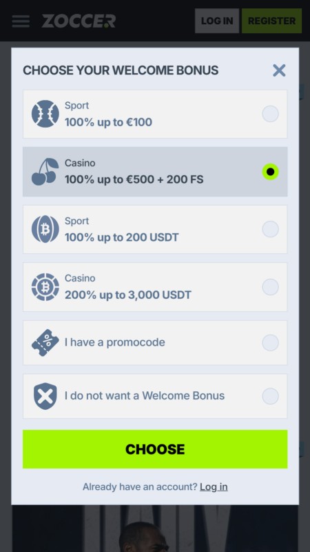 Izberi bonus dobrodošlice (kazino, šport ali kripto različica) oziroma nadaljuj brez bonusa.
