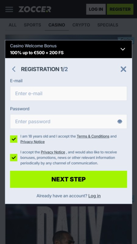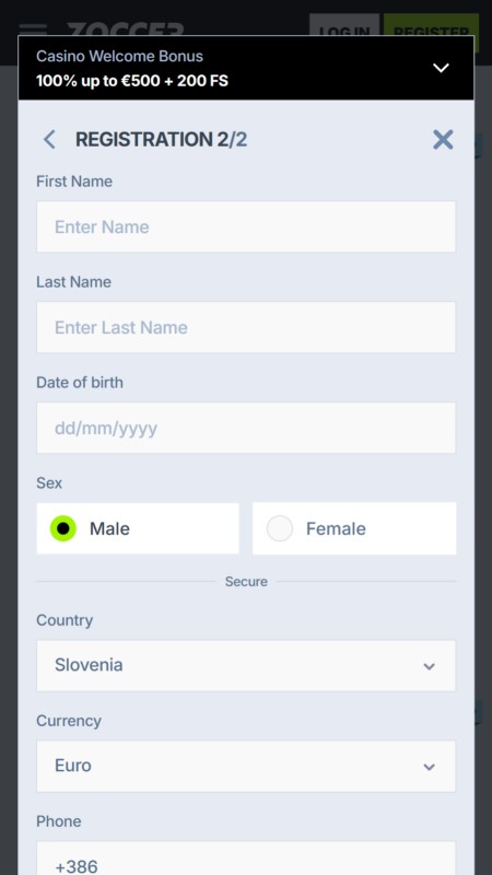 Odpri uradno stran Zoccer in klikni Register: https://zoccer.com/en/.