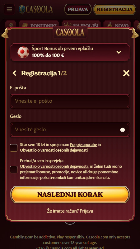 Registracija pri Casooli je bila pri meni res hitra, ker je obrazec kratek in logično razdeljen. Ko imaš račun odprt, te platforma običajno vodi še do potrditve podatkov, kar je kasneje pomembno pri dvigih.