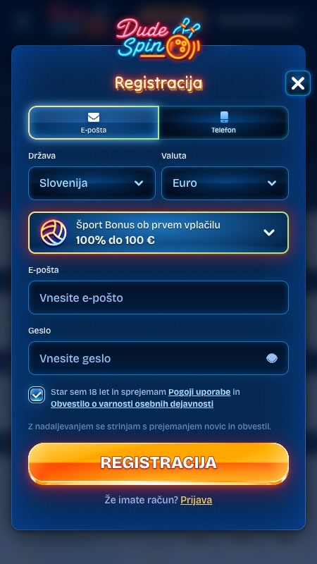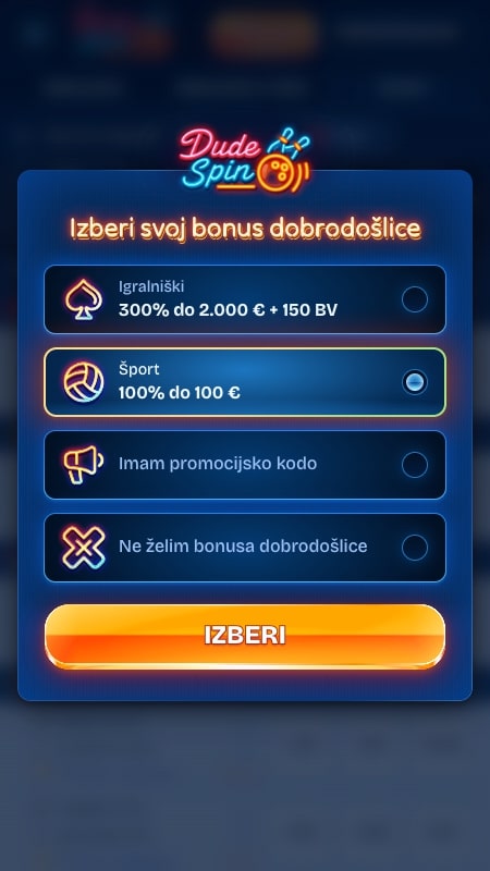 Korak 2 – Izberi svoj bonus dobrodošlice Prilagodi si nagradni paket po svoje. V DudeSpin Stavnici te čaka 100 % bonus na prvi polog do 100 €. Če želiš, lahko izbereš Casino bonus ali pa preprosto igraš brez bonusa