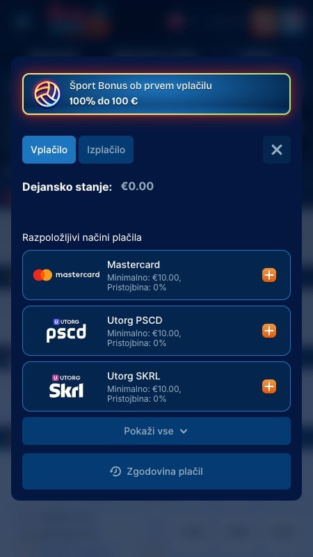 💰 Bonus ob prvem vplačilu: 100 % do 100 € za prve športne stave po registraciji.