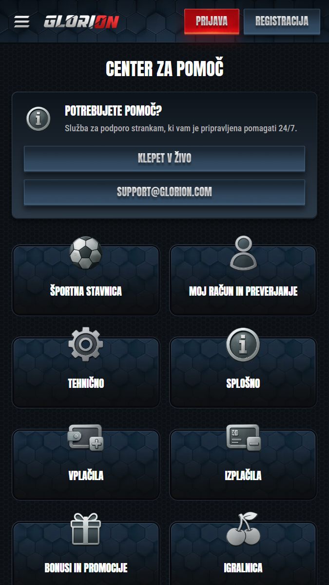 Podpora je na voljo vsak dan, najhitrejša pot je klepet v živo, za bolj kompleksna vprašanja pa lahko uporabite tudi e pošto. Glorion ima vmesnik v slovenščini, medtem ko je pomoč najpogosteje na voljo v večjih svetovnih jezikih.