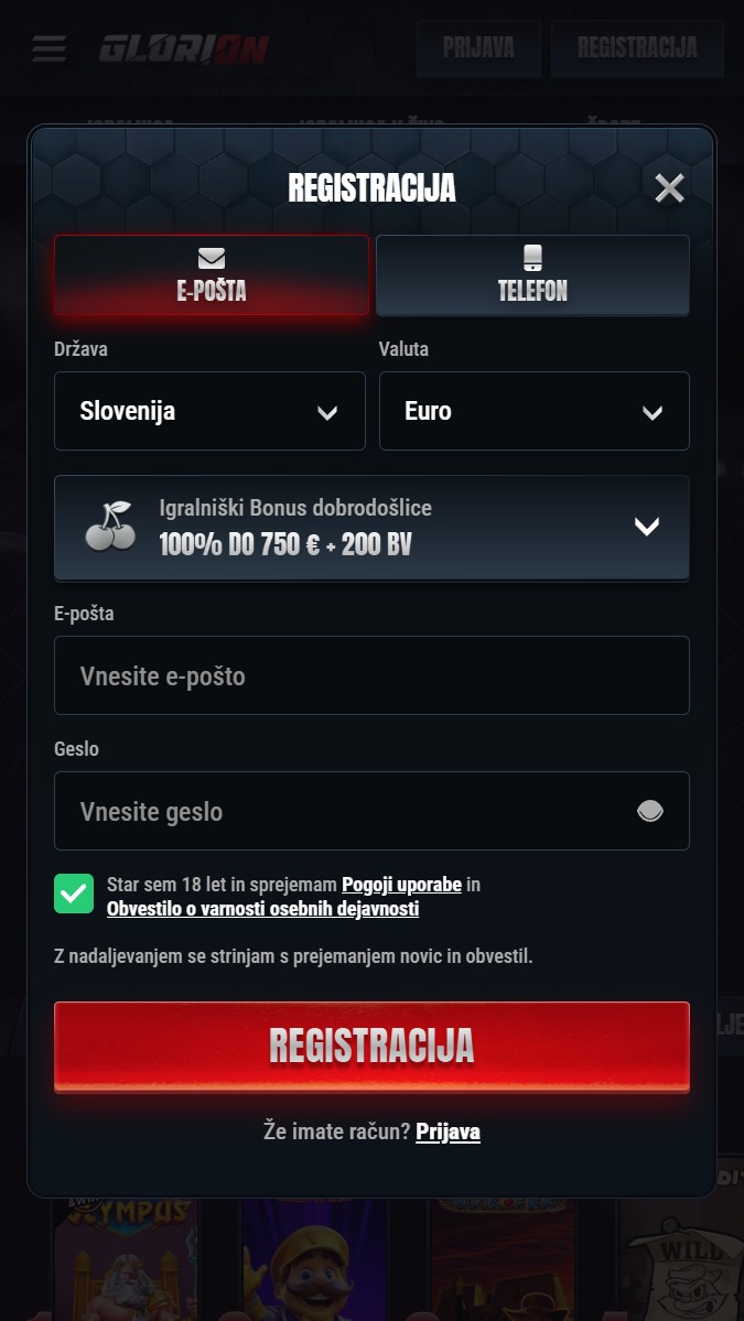 Registracija v Glorion je hitra in dovolj pregledna, da se lahko do iger in promocij premaknete skoraj takoj. Vmes je dobro, da vnesete resnične podatke, ker se ti kasneje uporabljajo pri preverjanju računa in izplačilih.