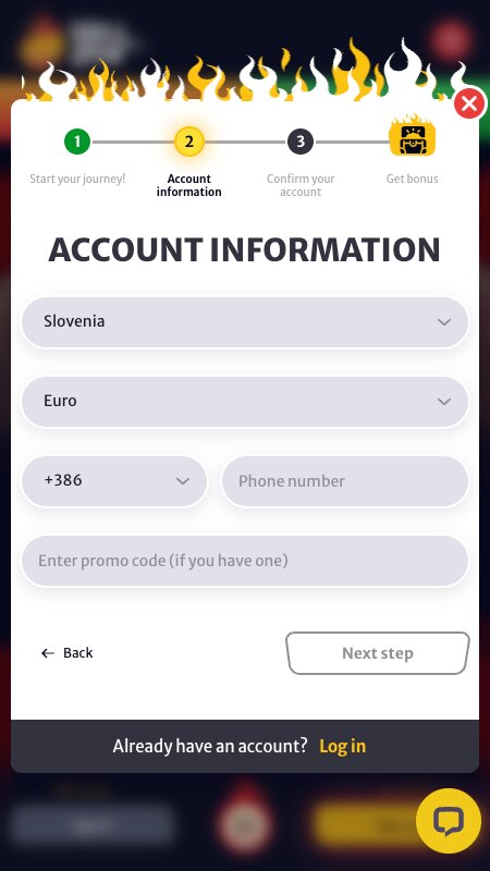 Nato izbereš državo, valuto in dodaš telefonsko številko. Če imaš promo kodo, jo lahko vpišeš tukaj.