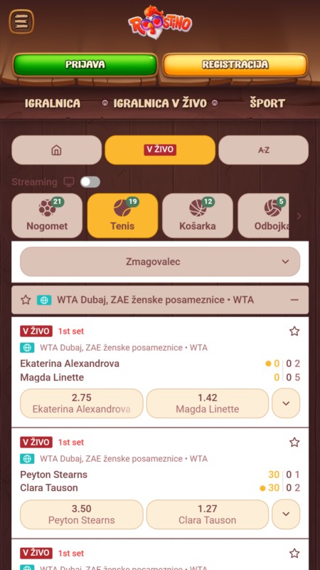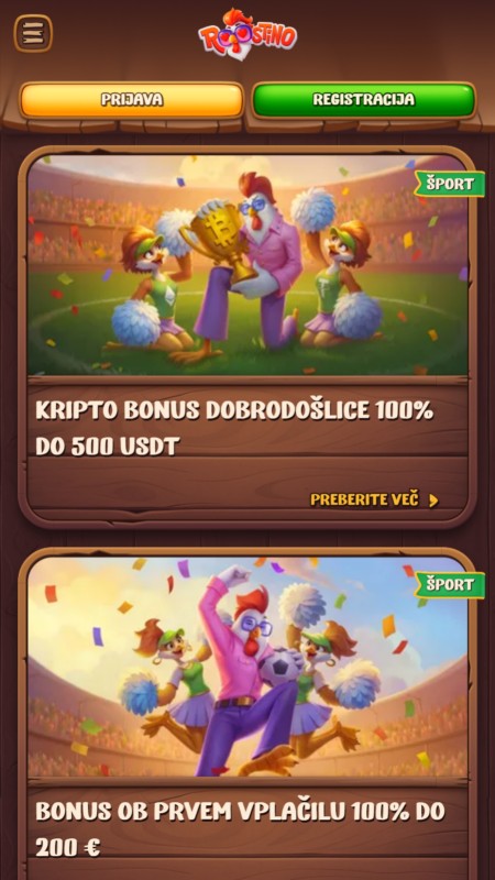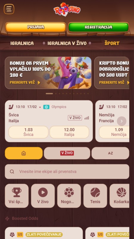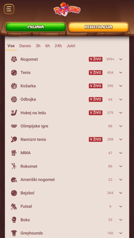 Vmesnik Roostino deluje precej igrivo in tematsko. Veliko je toplih rjavih odtenkov, lesa in risanih ilustracij, kar je drugače od klasičnih športnih stavnic, ki so običajno bolj sterilne. Navigacija je kljub temu jasna, športi so hitro dostopni, listič je pregleden, live sekcija pa se nalaga brez čudnih preskokov. Če ti je všeč bolj gaming stil, je to vsekakor plus.