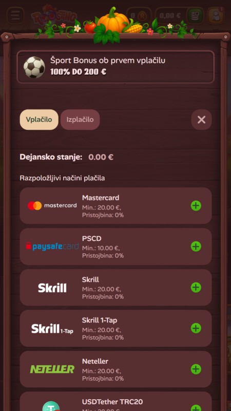 Vmesnik Roostino deluje precej igrivo in tematsko. Veliko je toplih rjavih odtenkov, lesa in risanih ilustracij, kar je drugače od klasičnih športnih stavnic, ki so običajno bolj sterilne. Navigacija je kljub temu jasna, športi so hitro dostopni, listič je pregleden, live sekcija pa se nalaga brez čudnih preskokov. Če ti je všeč bolj gaming stil, je to vsekakor plus.