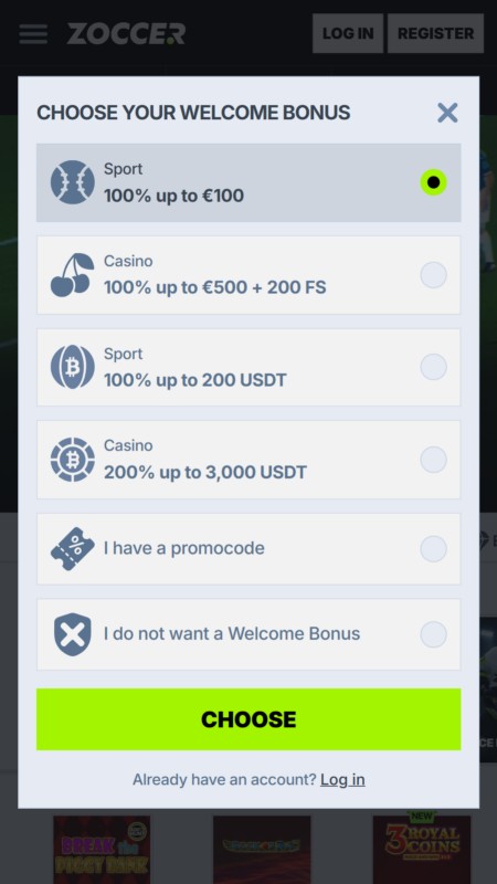Izberete ponudbo dobrodošlice. Na voljo so štiri možnosti: igralniški bonus 100% do 500 € + 200 BV, igralniški kripto bonus 200% do 3.000 USDT, športni bonus 100% do 100 € ter športni kripto bonus 100% do 200 USDT.