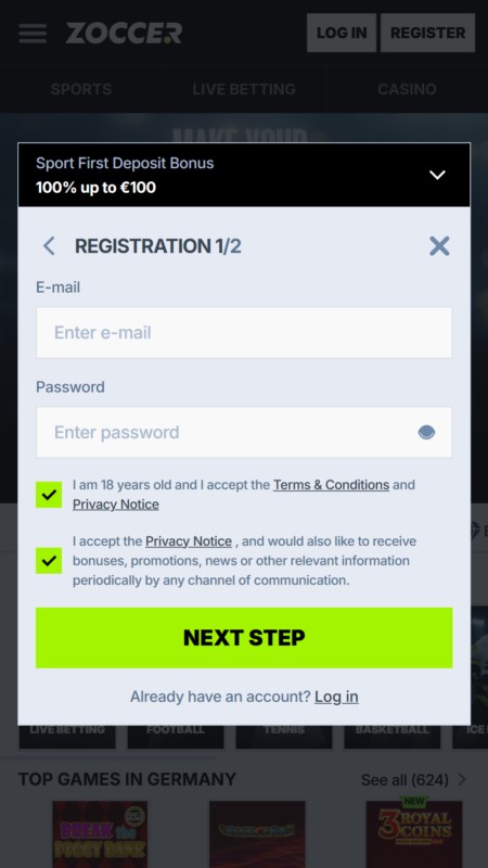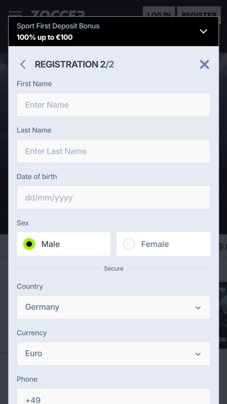 Igranje iger in stave za pravi denar v Zoccer zahtevajo ustvarjen račun. Spodaj so osnovni koraki registracije, ki jih opravite v nekaj minutah.